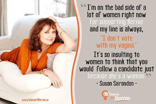 Sue Sarandon (who does not vote with her vagina.) suggests that those who are voting for Bernie's opponent are merely voting with their vaginas for a vagina because (the opponent) has a vagina, which is why they all supported Sarah Palin because genitalia over issues of course.